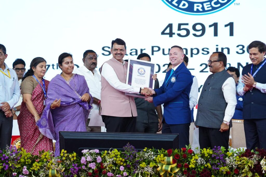 Maharashtra State Electricity Distribution Company Limited (MSEDCL) has successfully driven the installation of 45,911 off-grid solar agricultural pumps in just 30 days, as awared by the Guinness World Records (GWR). This achievement positions Maharashtra as the fastest-deploying solar agriculture state in India and second only to China globally in the scale and speed of solar pump deployment by a single administrative region. Shri Lokesh Chandra, IAS, Chairman & Managing Director, MSEDCL, added, “This success has been possible due to efficient scheme design, transparent vendor empanelment, and strict service-level compliance. Every vendor is mandated to resolve farmer grievances within three days, failing which the matter escalates to MSEDCL for action. The State has also adopted a policy to release new agricultural connection throgh off-grid solar pumps, shifting fully to solar-based solutions. Our pump- sizing policy: 3 HP for up to 2.5 acres, 5 HP for up to 5 acres, and 7 HP for larger holdings. This ensures equitable distribution and maximum benefits to small and marginal farmers.”