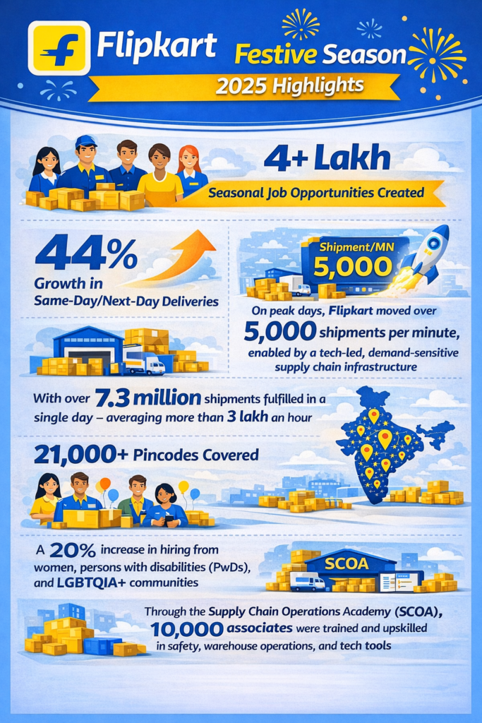 Flipkart, India’s homegrown e-commerce marketplace, today announced key milestones from its 2025 festive season – highlighting scale, speed, and social impact. The Big Billion Days were powered by its robust logistics network, which fulfilled record volumes, enabled near-instant deliveries, and significantly expanded its regional footprint. With over 4 lakh seasonal job opportunities created, a 44% growth in same-day/next-day deliveries, and heightened demand from Tier 2 / 3 cities, Flipkart’s supply chain put both technology and people at the centre of India’s festive momentum.