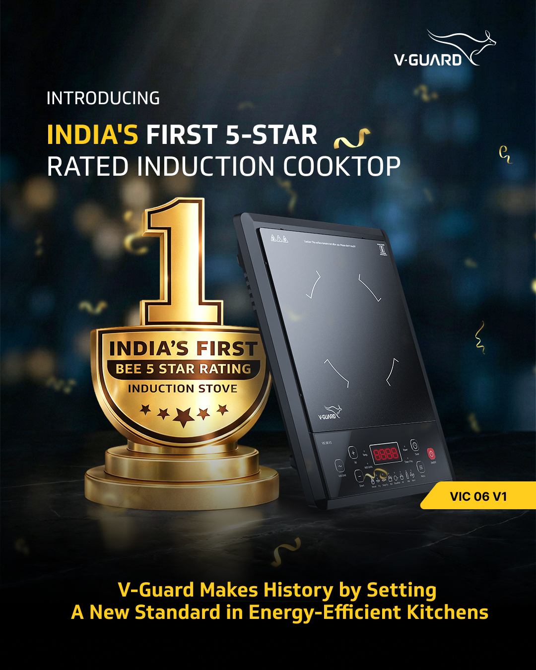 V-Guard Industries Limited, India’s leading consumer electrical and electronics brand, has achieved a landmark milestone with its Induction Cooktop Model VIC06V1 becoming India’sfirst induction cooktop to receive a 5-Star  energy efficiency rating from the Bureau of Energy Efficiency (BEE). The recognition underscores V-Guard’s commitment to energy-efficient innovation, in-house manufacturing excellence, and uncompromising quality standards. The VIC06V1 induction cooktop is designed and manufactured at V-Guard’s state-of-the-art Perundurai facility, reinforcing the brand’sfocus on indigenous design. Furthermore, the model has been engineered to deliver faster, cleaner andmore environment-friendly cooking while helping consumers reduce electricity consumption withoutcompromising on performance or convenience.The VIC06V1 (5-Star BEE Rated) induction cooktop delivers a maximum power output of 1600 W andfeatures eight power and temperature levels with eight preset cooking modes, enabling versatile andefficient everyday cooking. The soft-touch switch controls and easy-to-read digital display arecomplemented by a 4-hour timer, 24-hour preset function, and energy and voltage indicators for seamless monitoring and operation.