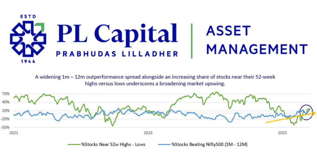 PL Asset Management highlights broader market participation in May, as the Nifty 50 Equal Weight rose 2.31%, Nifty 500 gained 3.5%, and the Nifty 500 Equal Weight Index surged 8.5%, led by strong consumer stocks. A widening 1M–12M outperformance spread and a rising share of stocks near 52-week highs underscore a broadening upswing.